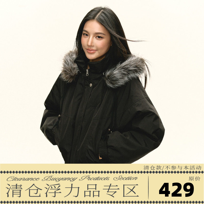 Ariseism American vintage removable gray fur collar hat black cotton jacket women's winter new padded jacket