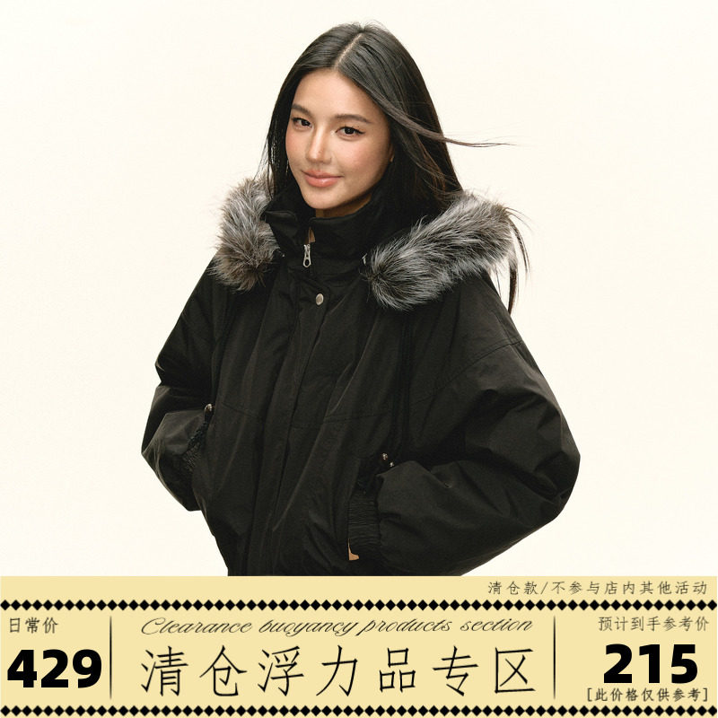 Ariseism American vintage removable gray fur collar hat black cotton jacket women's winter new padded jacket