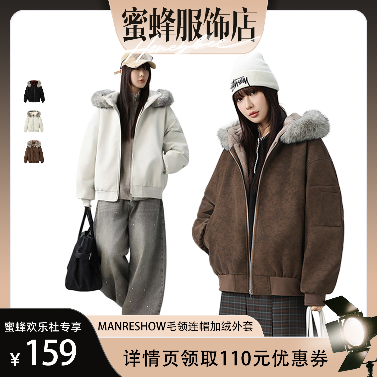 AONW Cat Ears Plush Hooded Cotton Jacket Women's 2025 Winter New Loose BF Street Rivet Cotton Clothing Trend