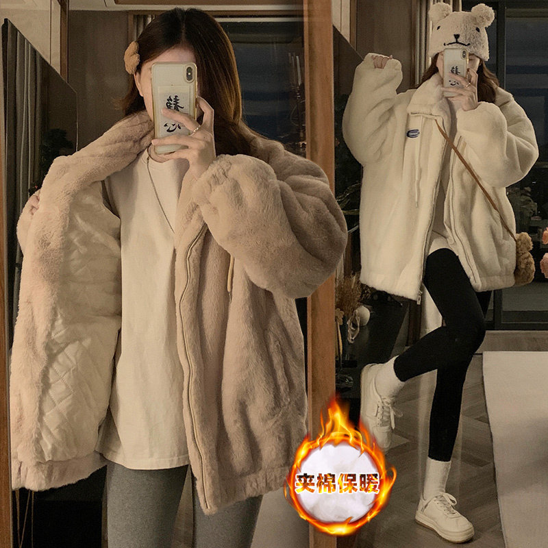Korean fleece thickened two-sided lambswool cotton jacket women's jacket winter new zippered hooded cotton jacket top
