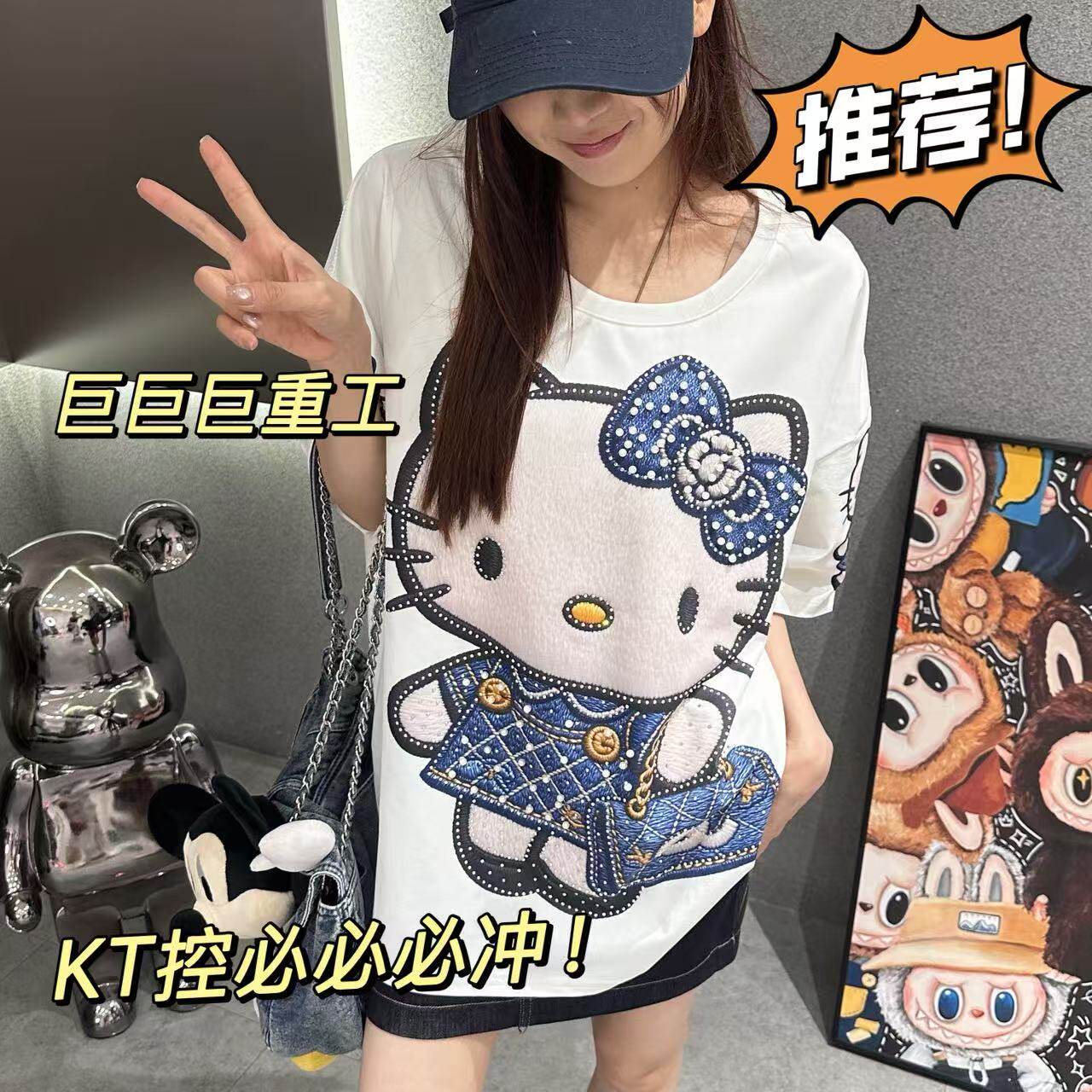Pick up leaks 0403 [Nana Welfare] embroidered KT nail beads round neck short sleeve T does not fade or change yuan