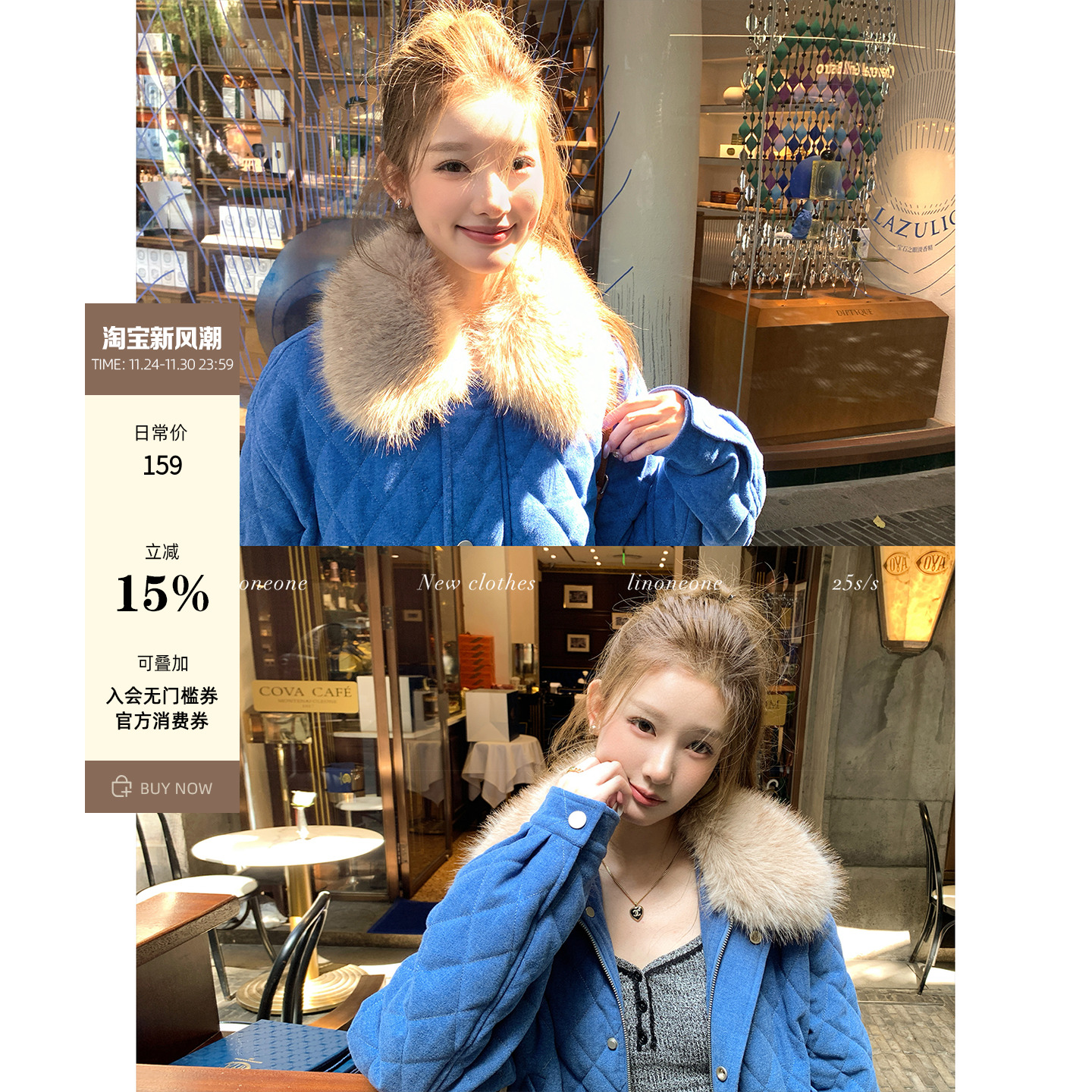 LINONEONE Hokkaido Walk Versatile Blue Diamond Plaid Padded Eco-Friendly Fur Collar Padded Jacket