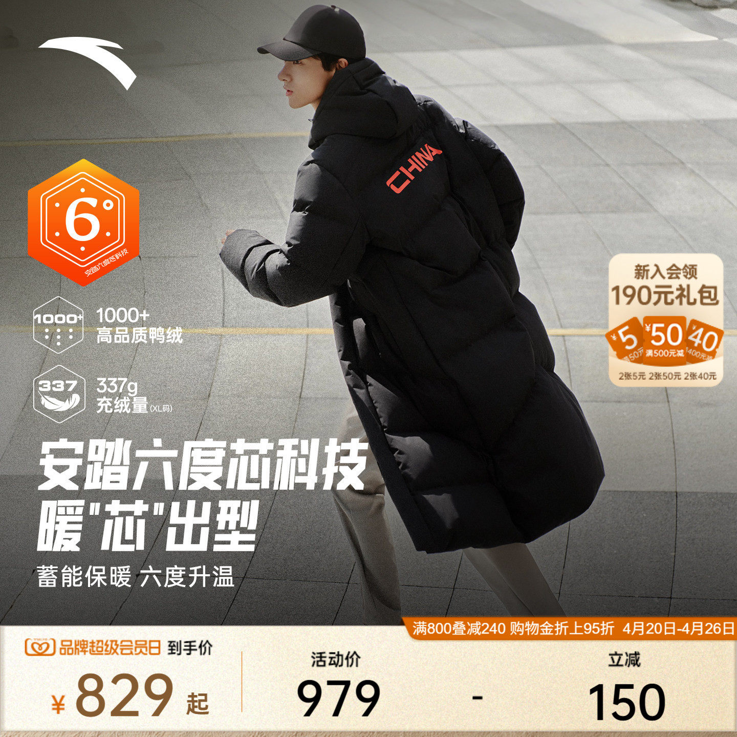Anta Lin Xiaojun down jacket men's spring new over-the-knee long cotton jacket duck down warm sports jacket top
