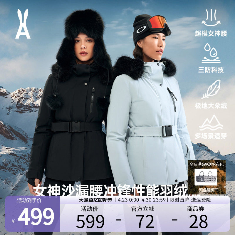 An Ou Rabbit small waist essence down pie overcomes women's three-proof fabric thickened, mid-length waist ski suit fur collar can be removed