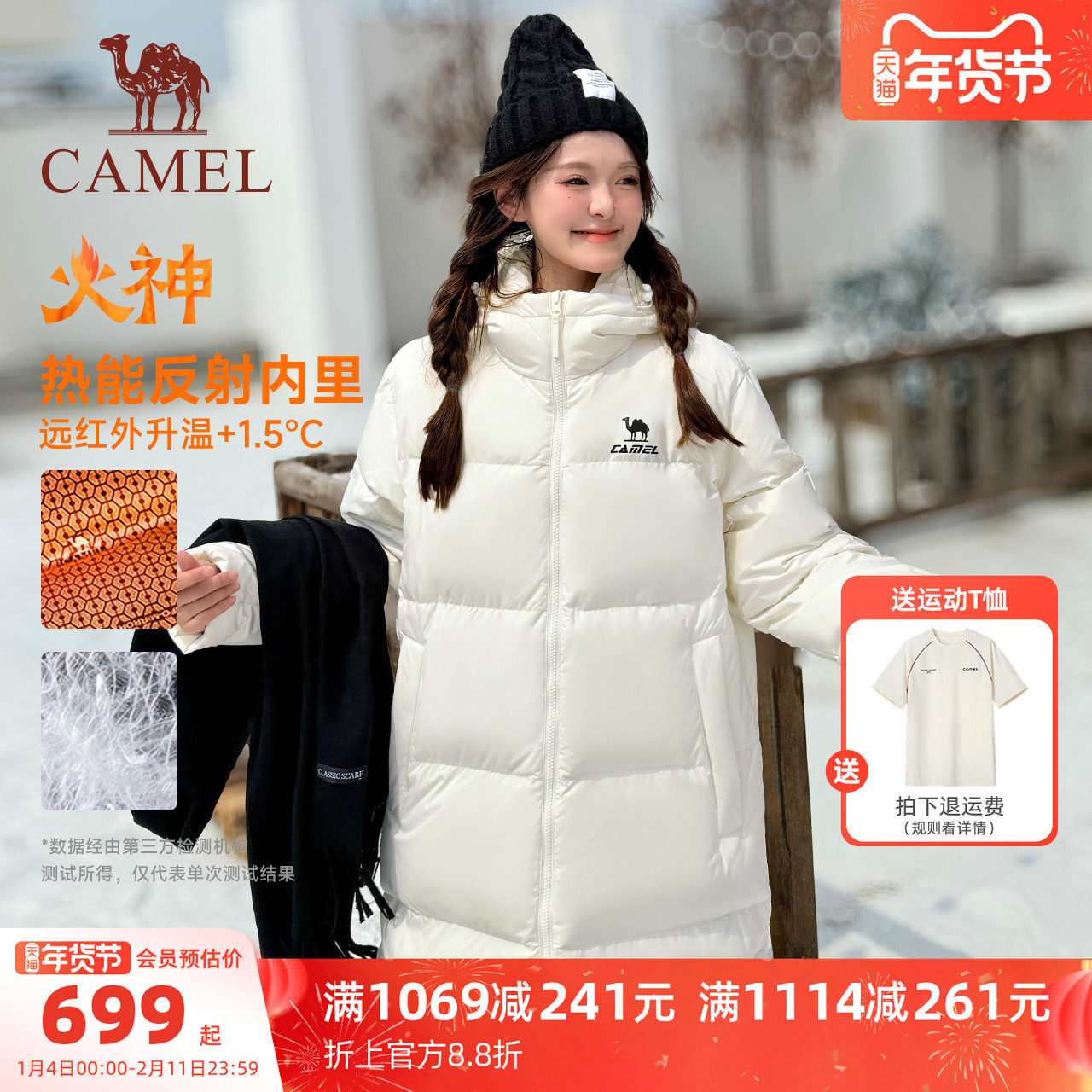 Camel Vulcan down jacket, Beiying mid-length winter women's men's 90-down thickened hooded water-repellent down jacket
