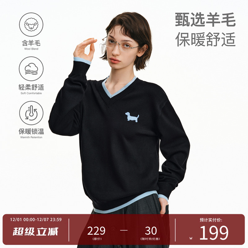 PCLP "wool blend" contrasting puppy pattern sweater autumn and winter national trend brand V-neck knit top for women and men