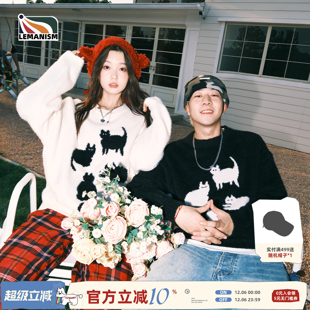 lemanism cartoon cat mohair sweater men's and women's trendy brand loose lazy knitwear autumn and winter trendy brand sweaters