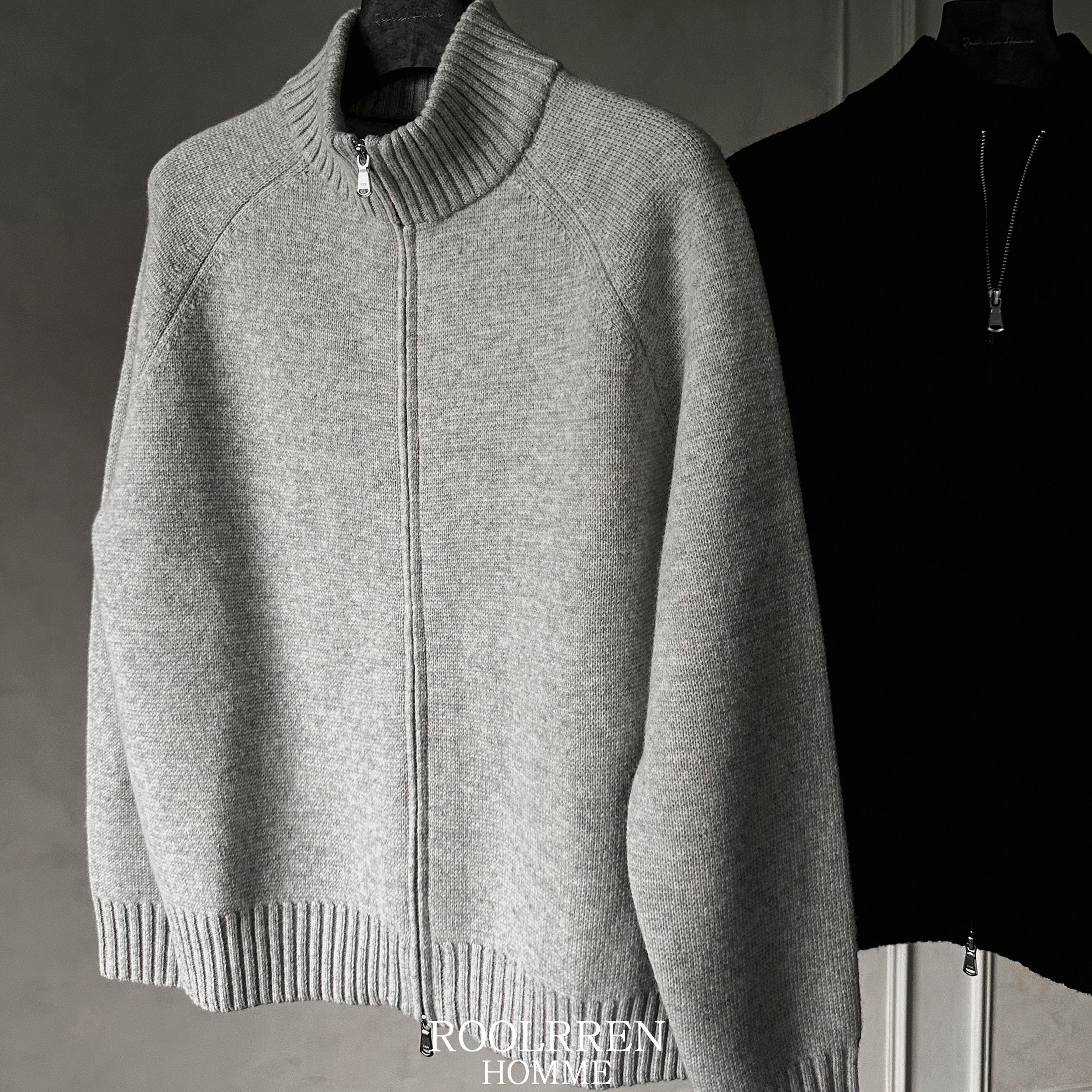 ROOLRREN100% wool moire [commuting versatility] sweater knit stand-up collar zipper cardigan jacket