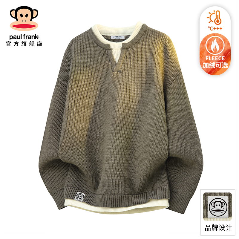 PaulFrank/Big Mouth Monkey's new casual knitted sweater men's 2025 winter fleece fake two-piece warm top