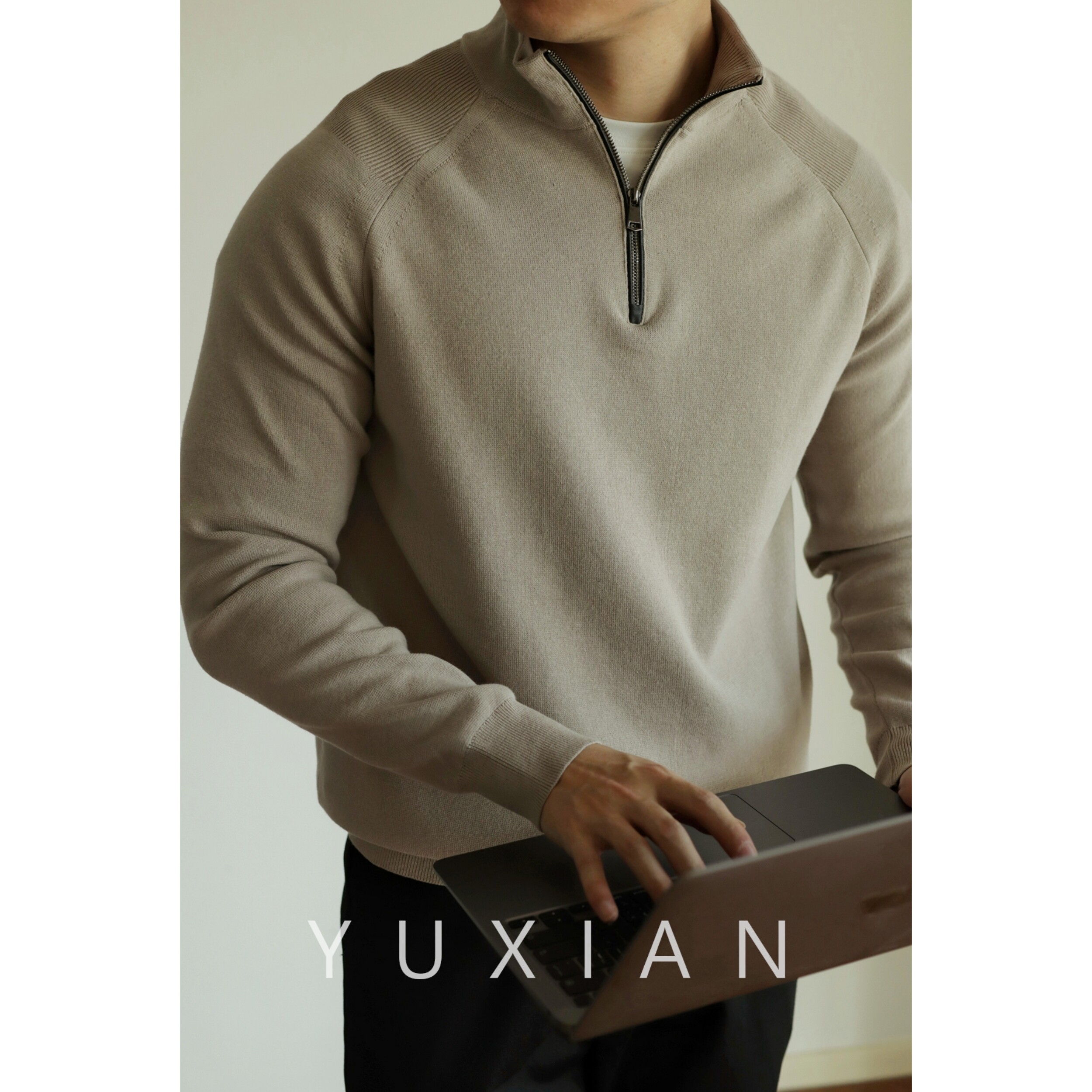 YUXIAN Fall & Winter High Twist Long Stand Cotton Vintage Semi Turtleneck Zipper Solid Color Pullover Knitted Long Sleeve Sweater for Men