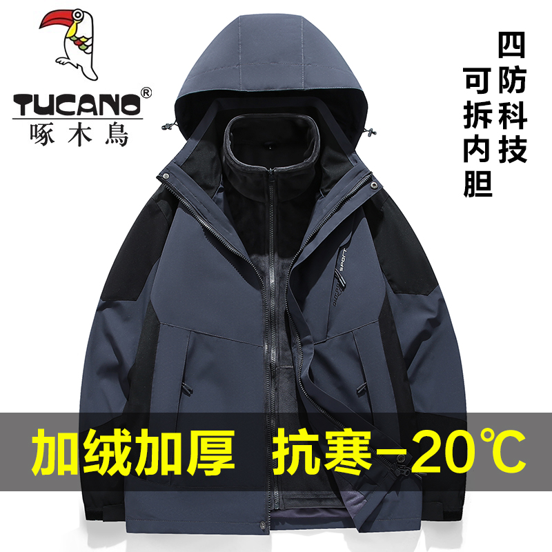 Woodpecker jacket men's three-in-one detachable autumn and winter jacket with fleece thickened windproof and waterproof mountaineering clothes