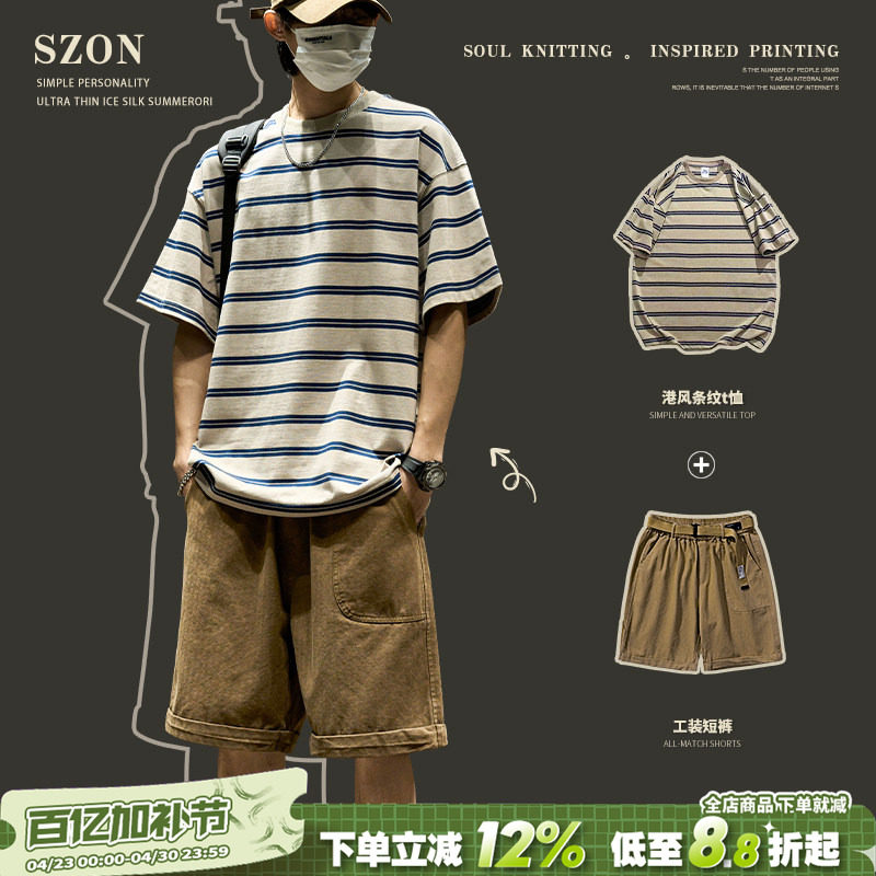 Casual suit men's summer American retro outfit with a full set of striped short-sleeved T-shirts with loose cargo shorts