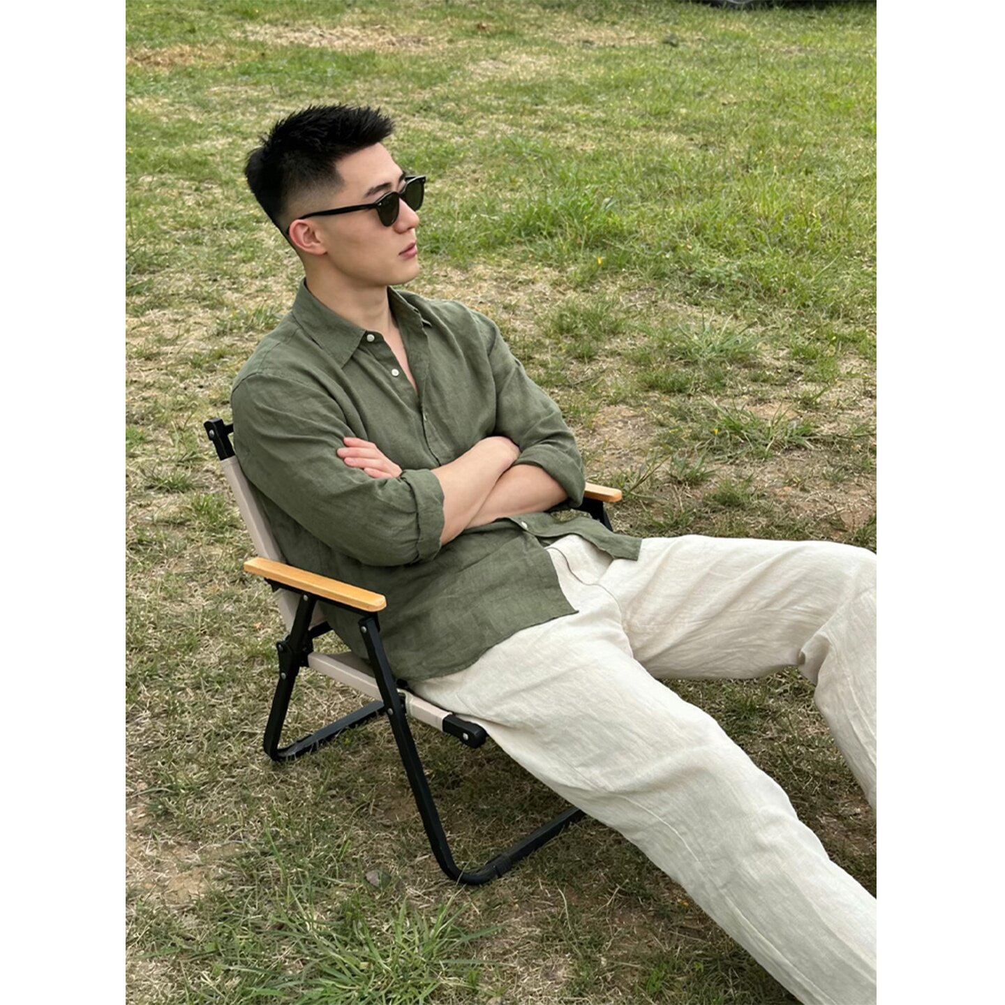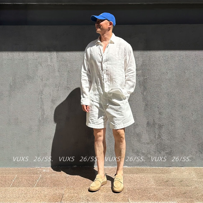 High-end old money style relaxed linen long sleeve shirt set for men's 2026 summer casual lazy style complete set