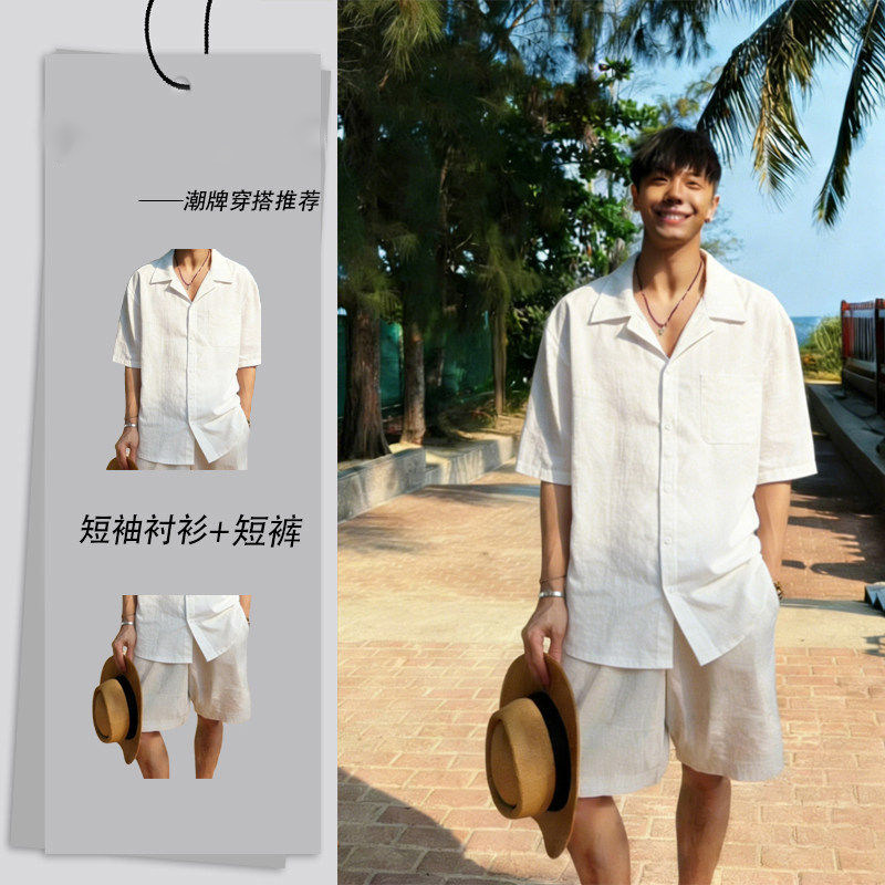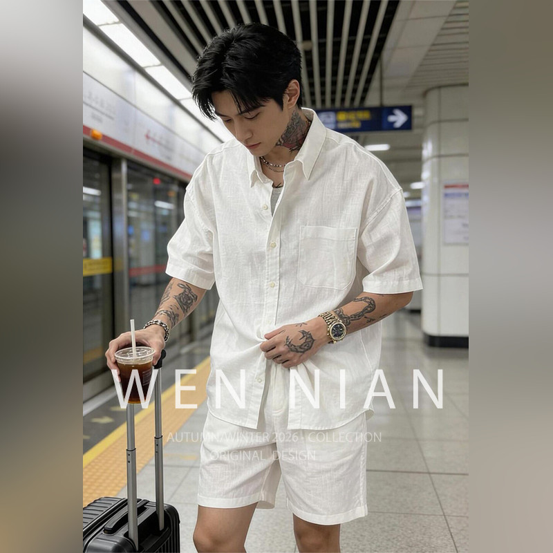 South Korea's WEN NIAN seaside vacation old money style short-sleeved suit men's 2026 summer high-end linen set a set