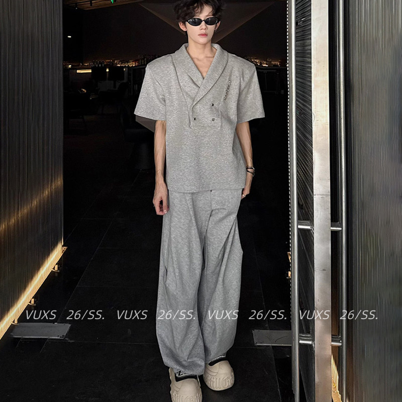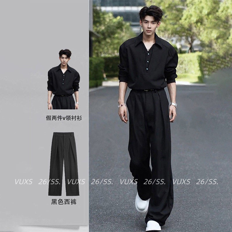 High-end yuppie style men's fake two-piece shoulder pad V-neck shirt set 2026 spring shirt with trousers two-piece set