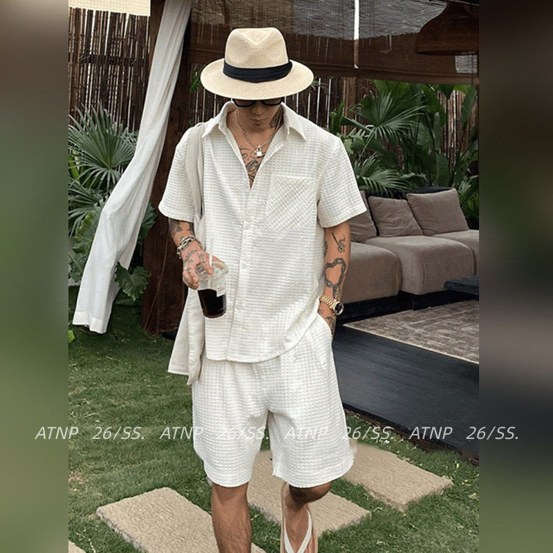 High-end white wagoff short-sleeved old money style outfit set men's 2026 summer vacation casual shirt set a set