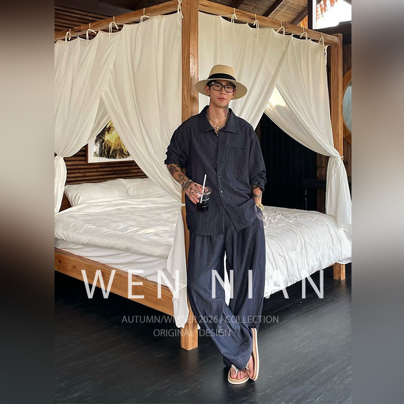 South Korea WEN NIAN Old Money Style Linen Sunscreen Shirt Set Men's 2026 Spring and Summer Ice Silk Cotton Linen Wide-leg Pants