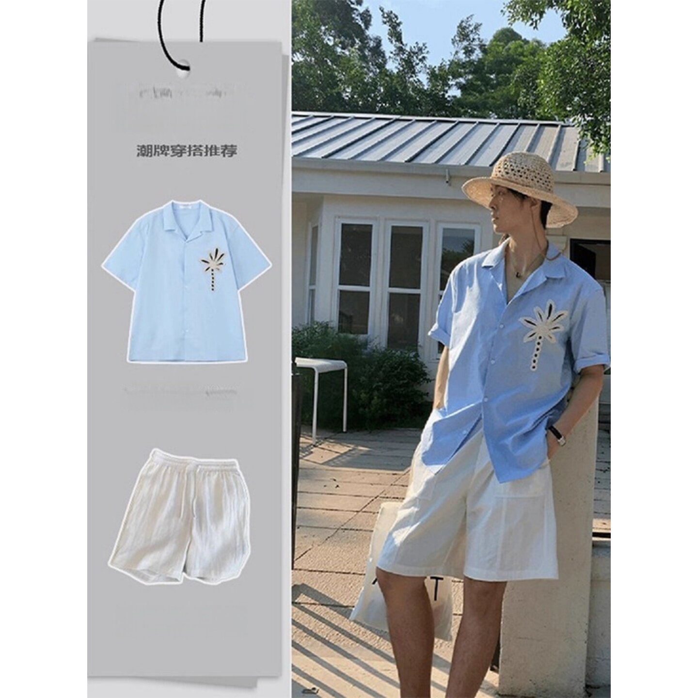 American sky blue embroidered shirt short-sleeved shorts set men's summer loose cooling top pants set in a set