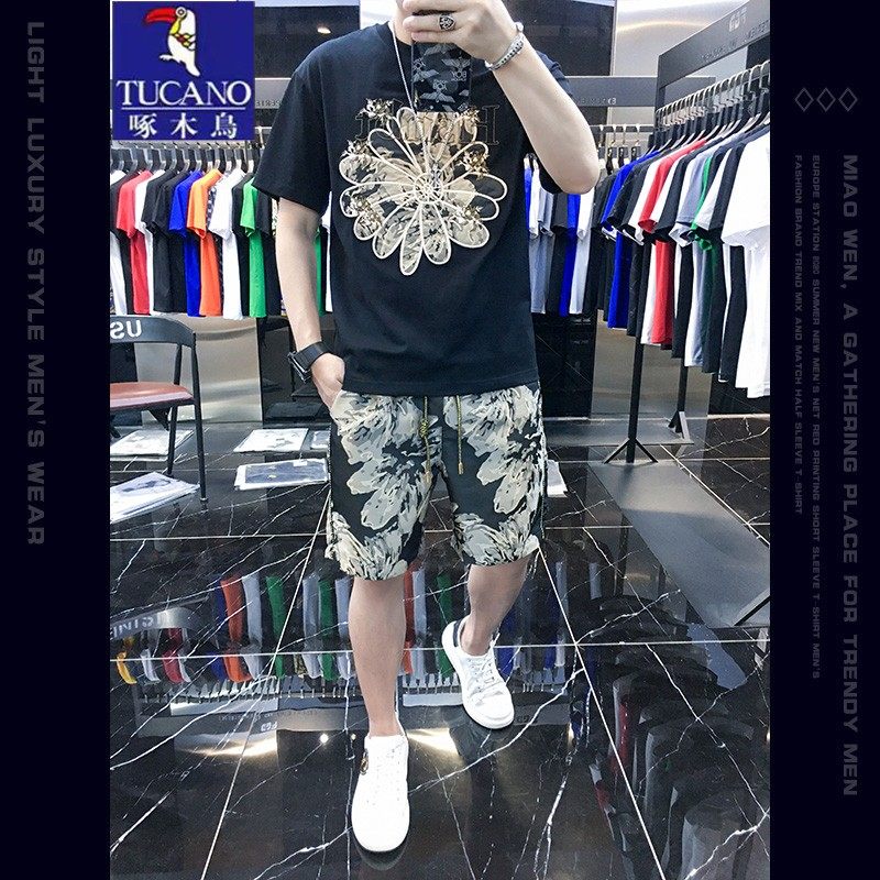 Woodpecker Casual Suit Men's Short Sleeve Shorts 2026 Summer Trend Ice Silk T-Shirt Thin Fashion Two-Piece Set