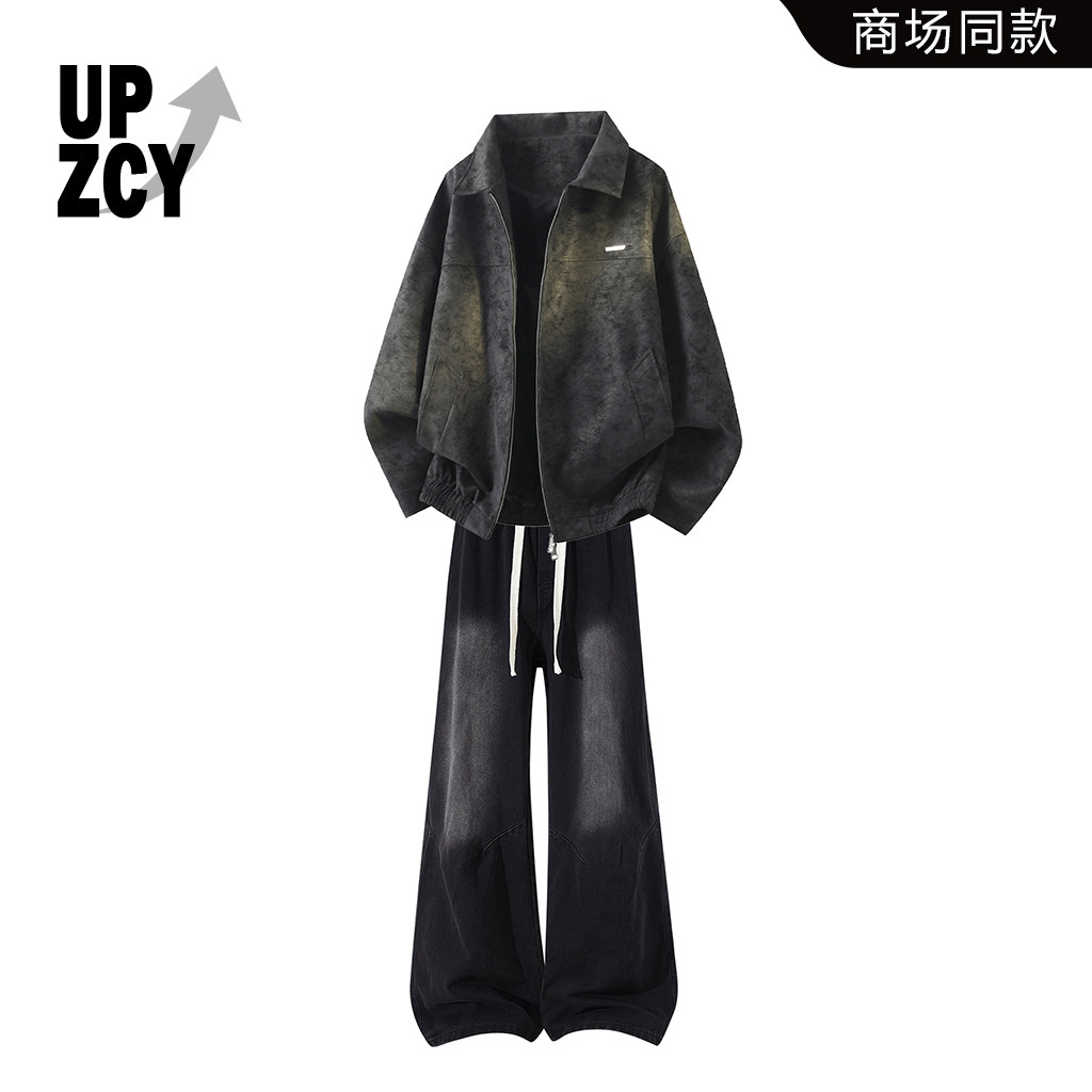UPZCY American PU Leather Lapel Jacket Men's Spring Suit Loose and Versatile Casual Tie-Dye Jeans Two-Piece Set