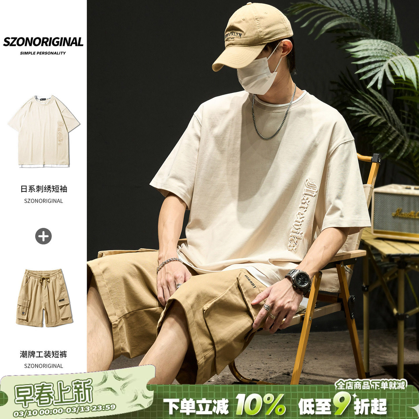 The set men's summer Japanese trendy brand pure cotton is versatile, a complete set of 2026 new embroidered short-sleeved American cargo shorts