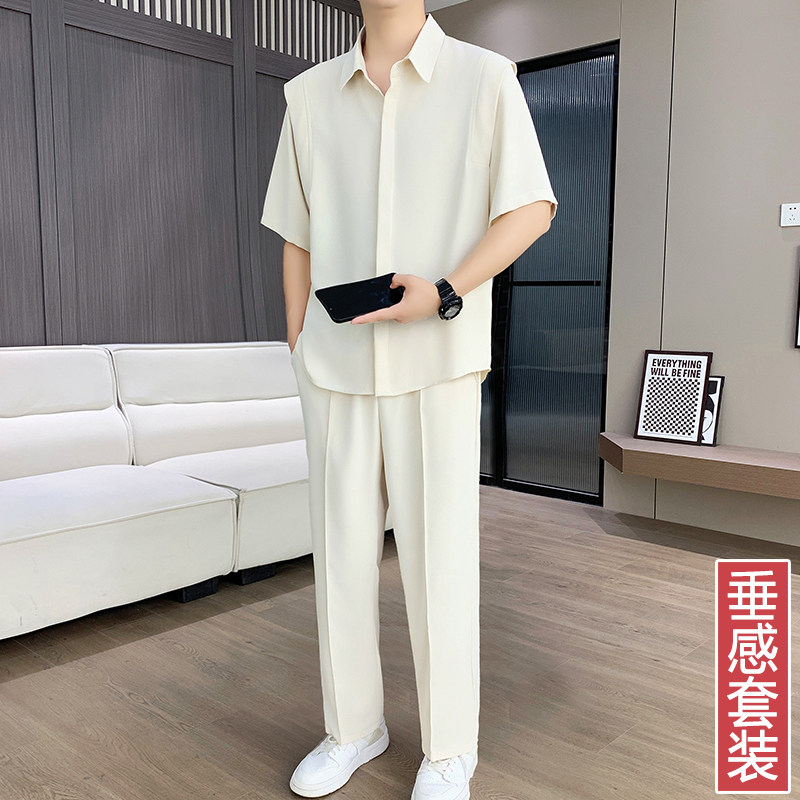 Summer suits, men's drapes, ice silk cropped pants, high-end fashion short-sleeved shirts, men's thin casual two-piece set