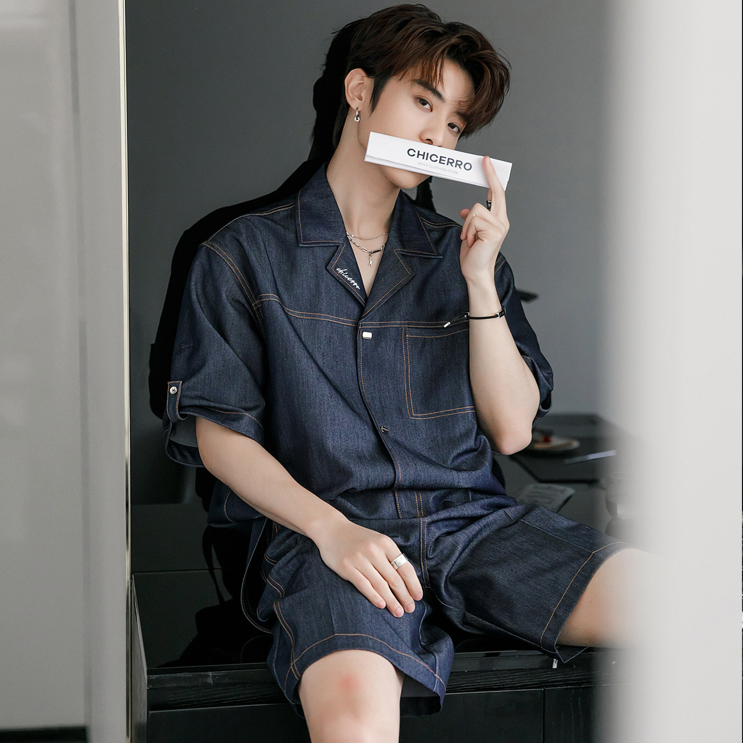 CHICERRO Sicilian Men's Summer Luxury Ice Silk Denim Cuban Collar Men's Casual Ruffian Handsome Suit Trend