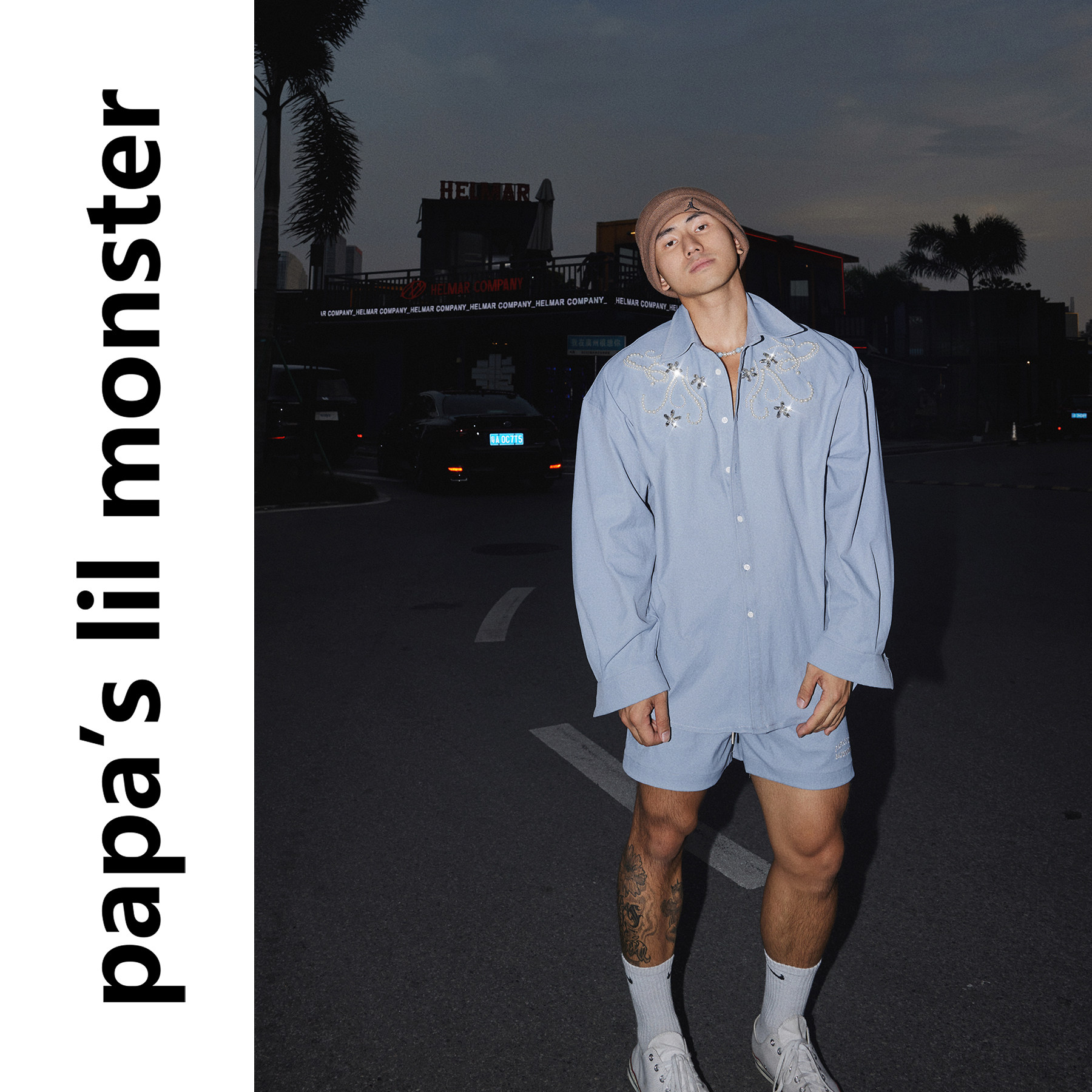 PAPASLILMONSTER [Original] luxury pearl accessory design sense long-sleeved shirt shorts suit for men