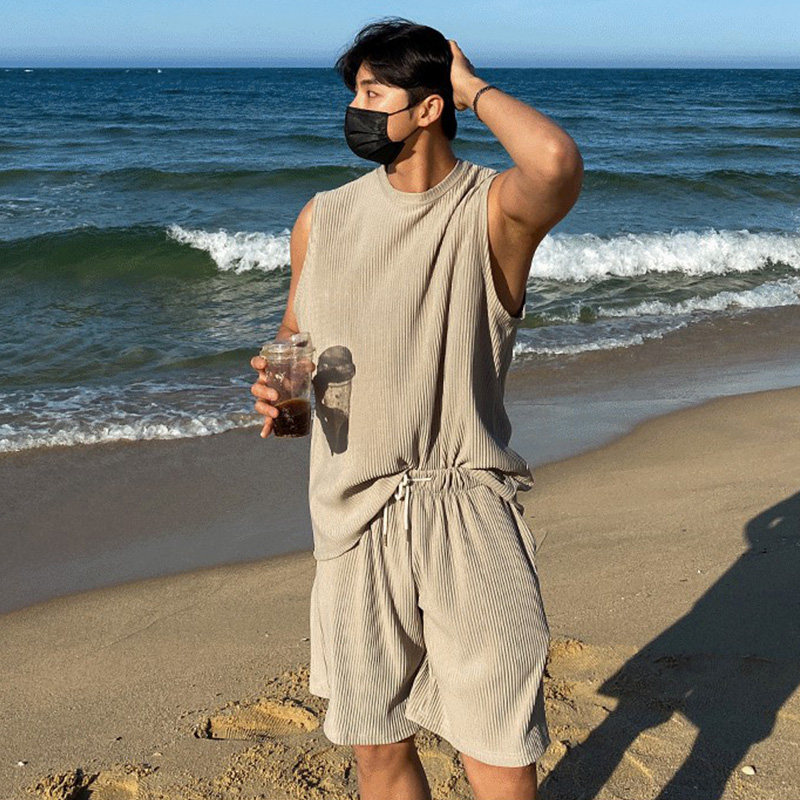Beach play suit men's new summer loose and breathable vest shoulder cropped shorts ice silk drape beach pants