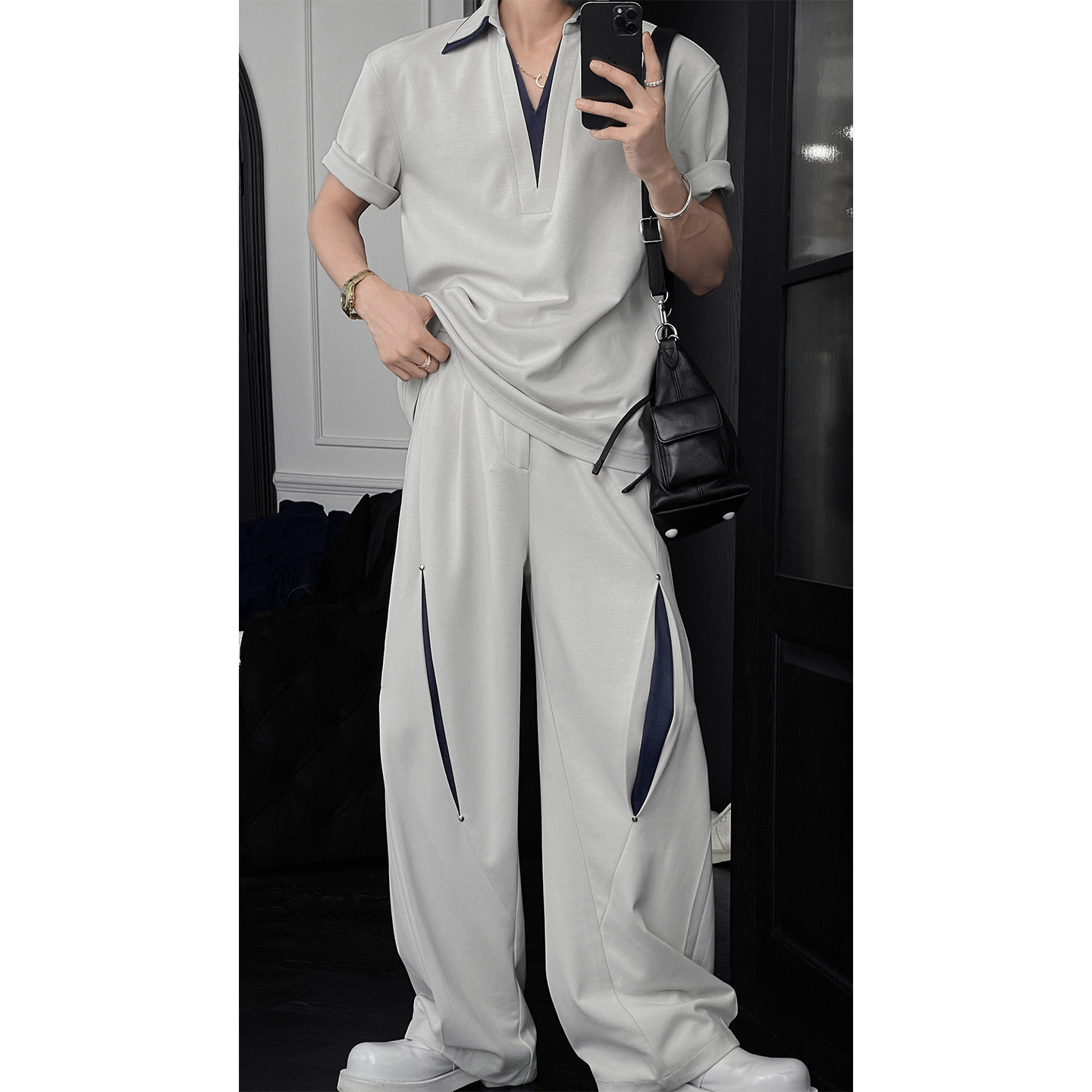 Long's new summer product niche design contrasting double-collar short-sleeved T-shirt suit men's loose drape slacks