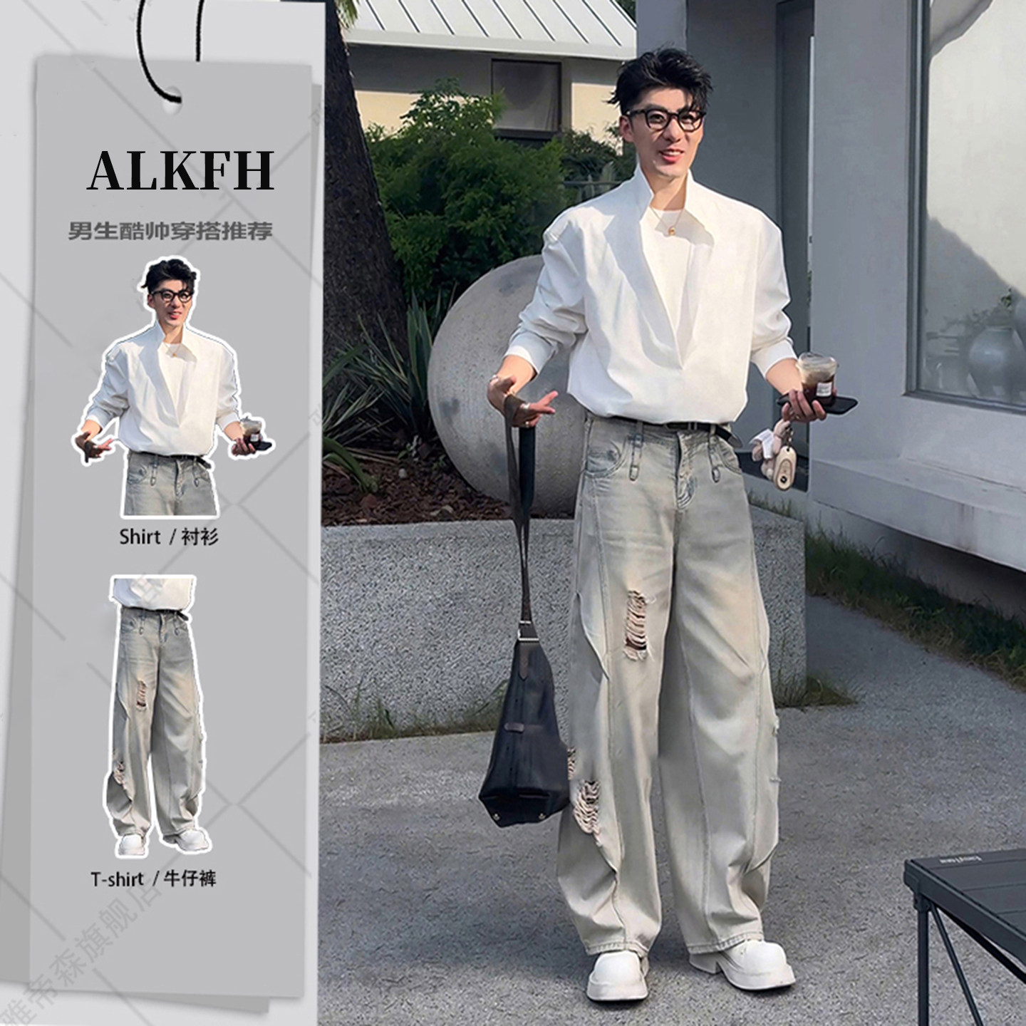 Lao Qian Feng Fake Two ice silk casual suits, a complete set of men's summer ruffians with American workwear ripped pants