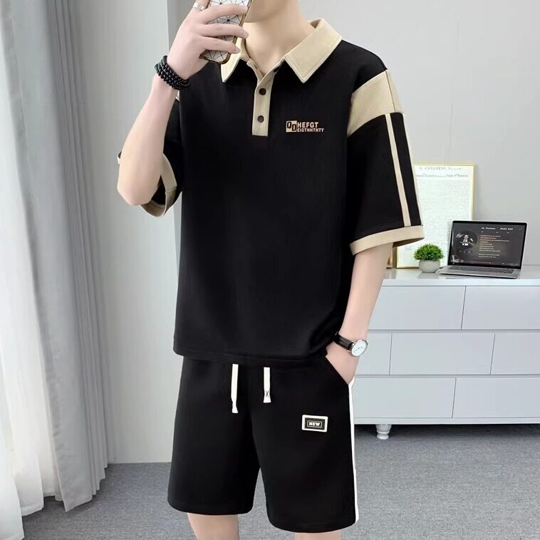 Men's polo shirt set short sleeve shorts set with summer teen lapel T-shirt loose trend two-piece set
