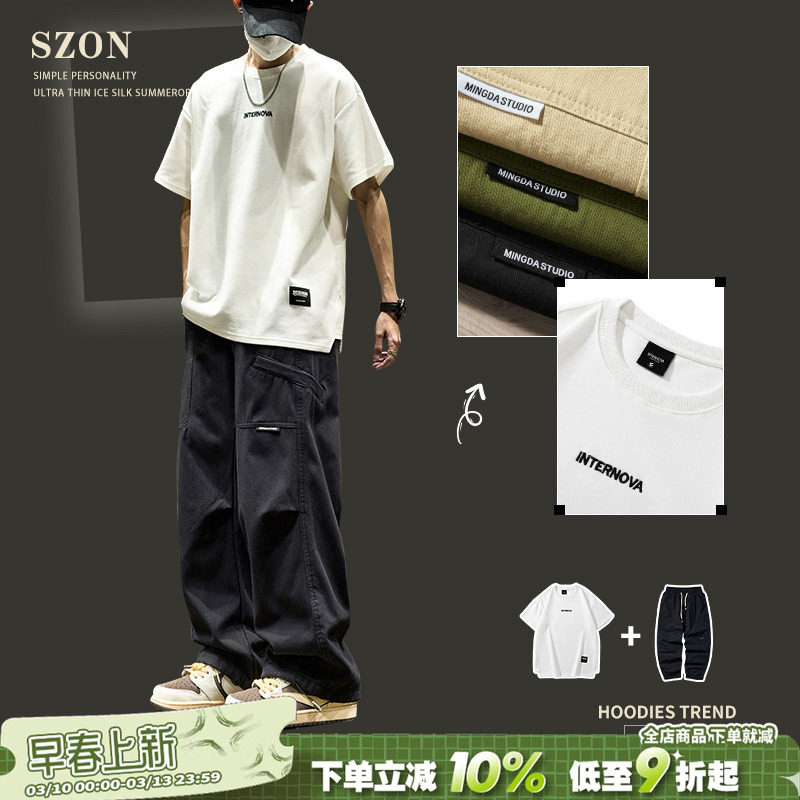 Casual suit men's summer new American trendy brand outfit with a short-sleeved T-shirt with personalized ruffian cargo pants