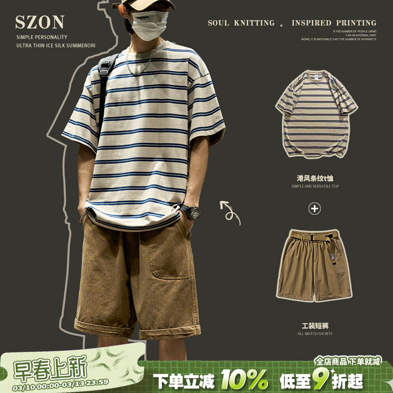 Casual suit men's summer American retro outfit with a full set of striped short-sleeved T-shirts with loose cargo shorts