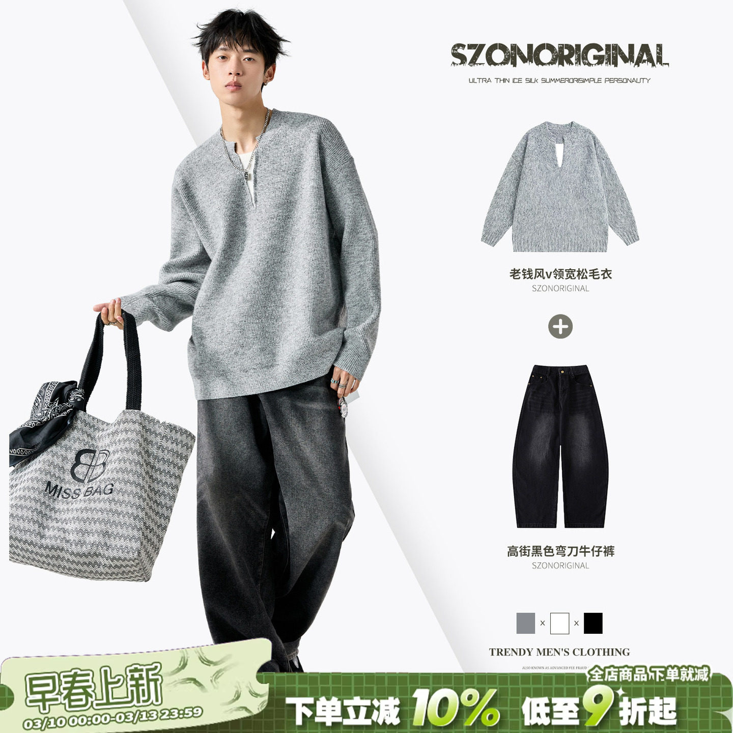 The set men's autumn Japanese contrasting V-neck sweater with black jeans is a complete set of high-end ruffians