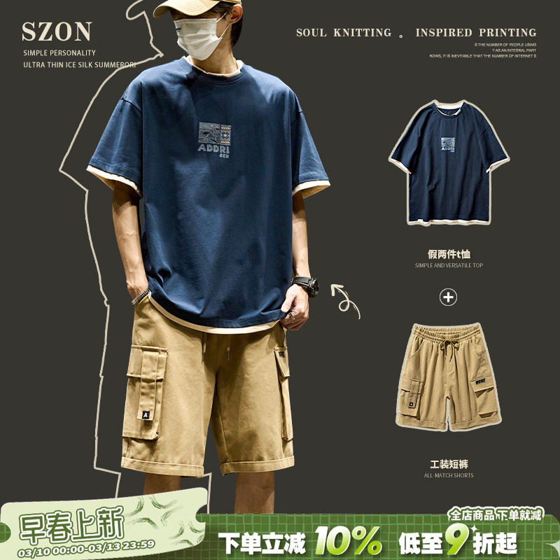 Short-sleeved suit men's summer loose casual wear a set of fake two-piece T-shirt with American trendy brand cargo shorts