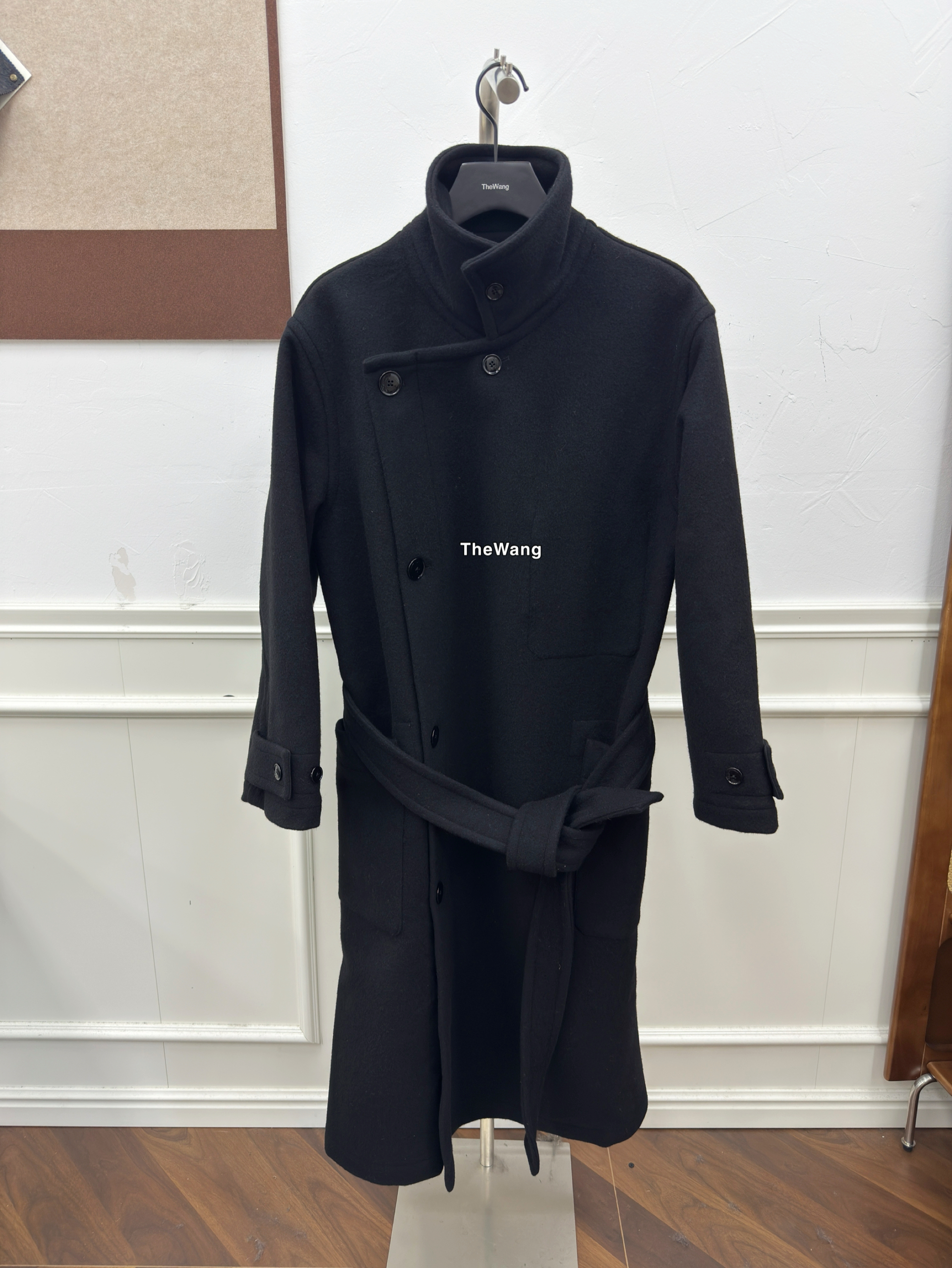 Lem25Fw Unisex Black Reversible 570G70 Count 100% Australian Wool Lace-up Stand Collar Coat Unisex