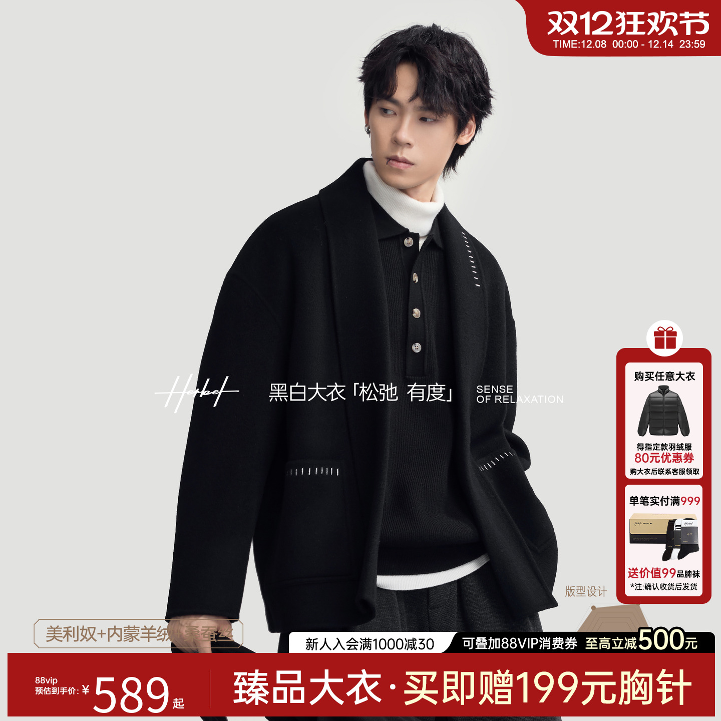 HERBEL/Black and White Tweed Coat Men's Winter 2025 New Warm Jacket Scarf Collar Wool Coat