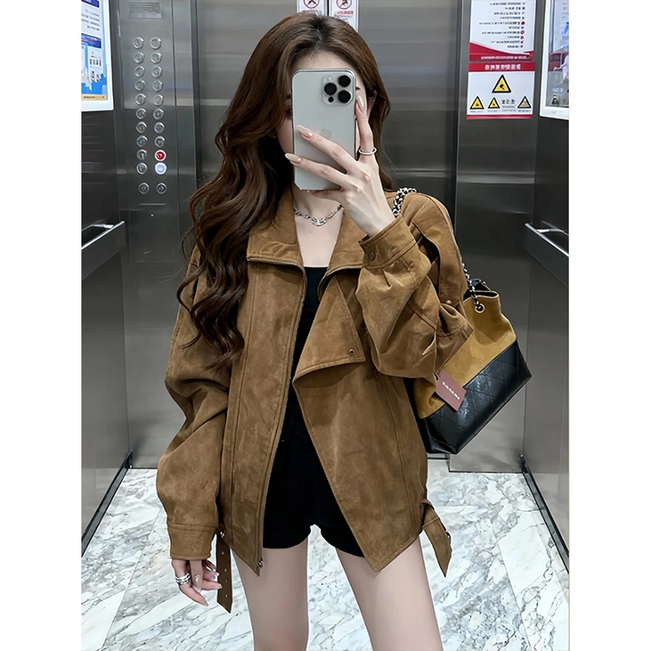 Vintage khaki deerskin fleece jacket women's short 2025 fall petite lapel cargo jacket versatile top