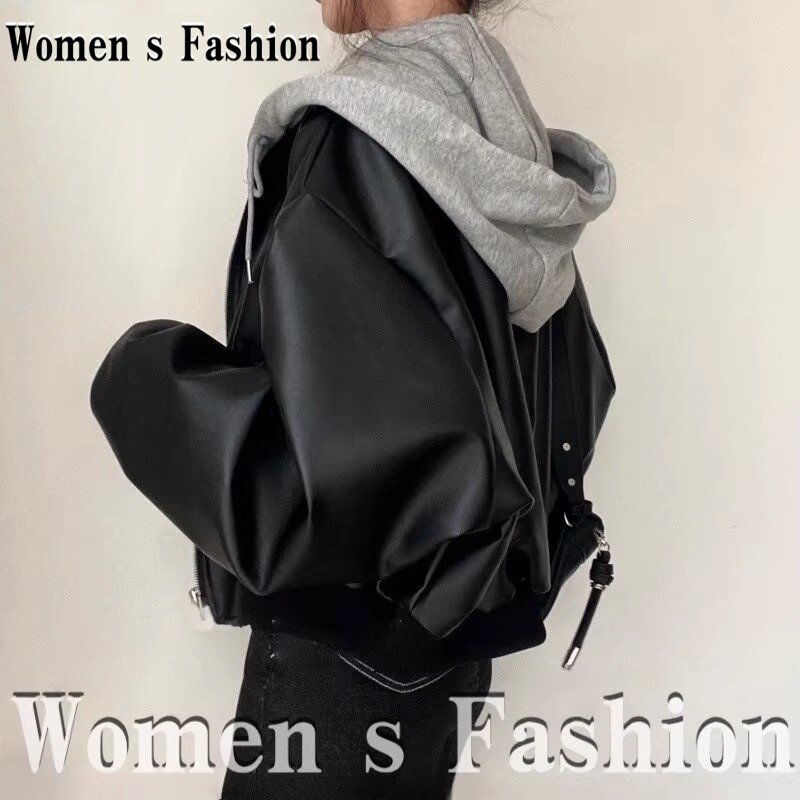 South Korea 2026 New Hooded Short Leather Jacket Women's Spring Fashion Versatile Petite Jacket Fake Two Coat