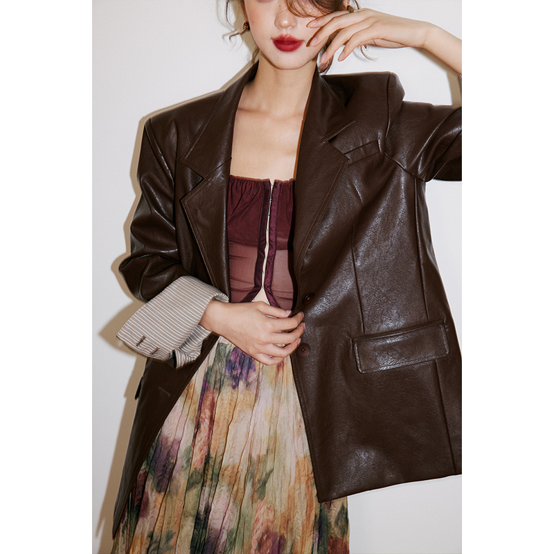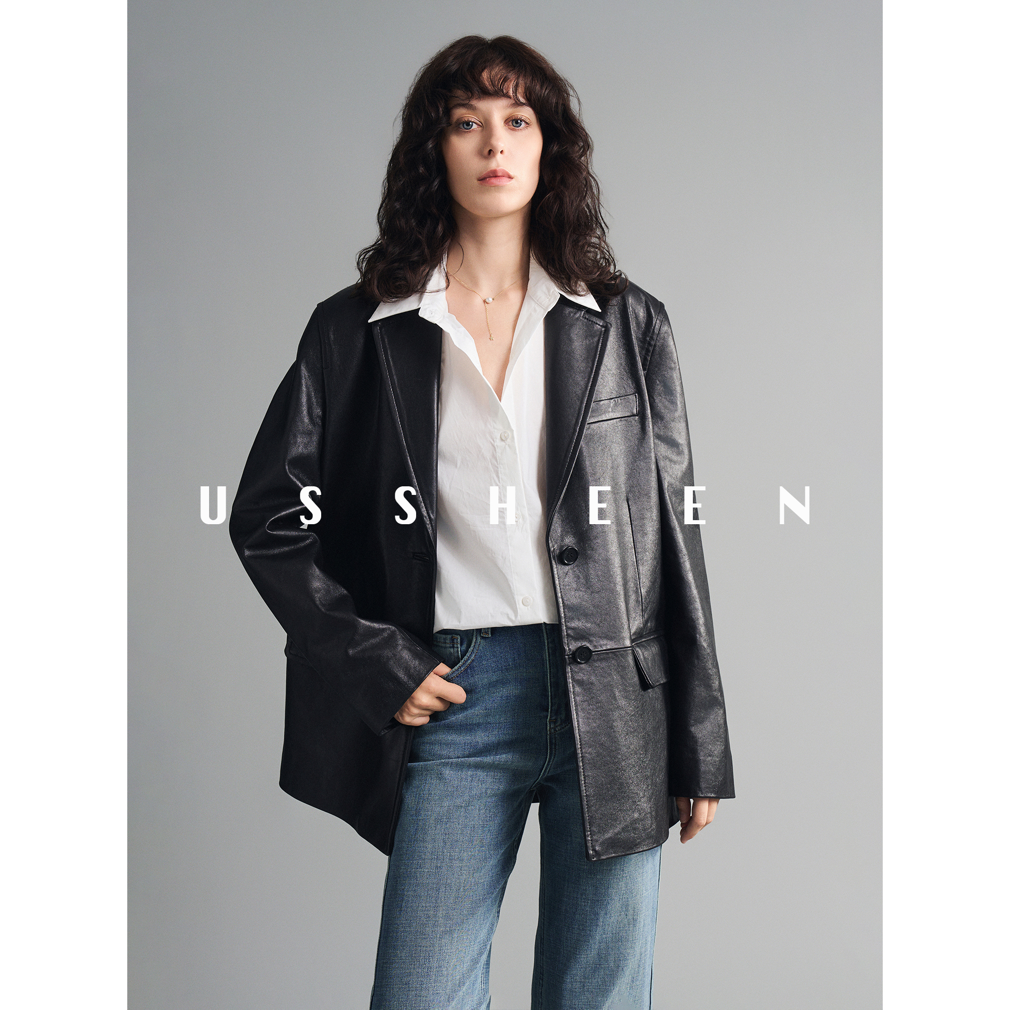 USSHEEN Wardrobe Classic Silhouette Modern Styling Slightly Broad Shoulders Loose Eco-Friendly Leather Suit Leather Jacket