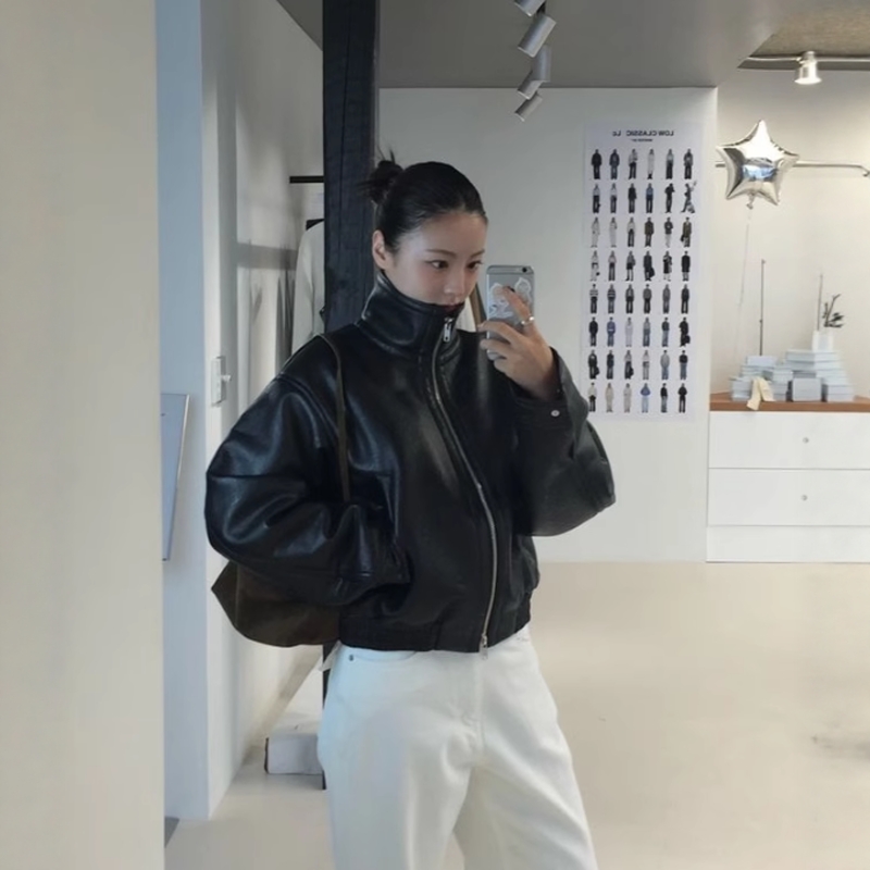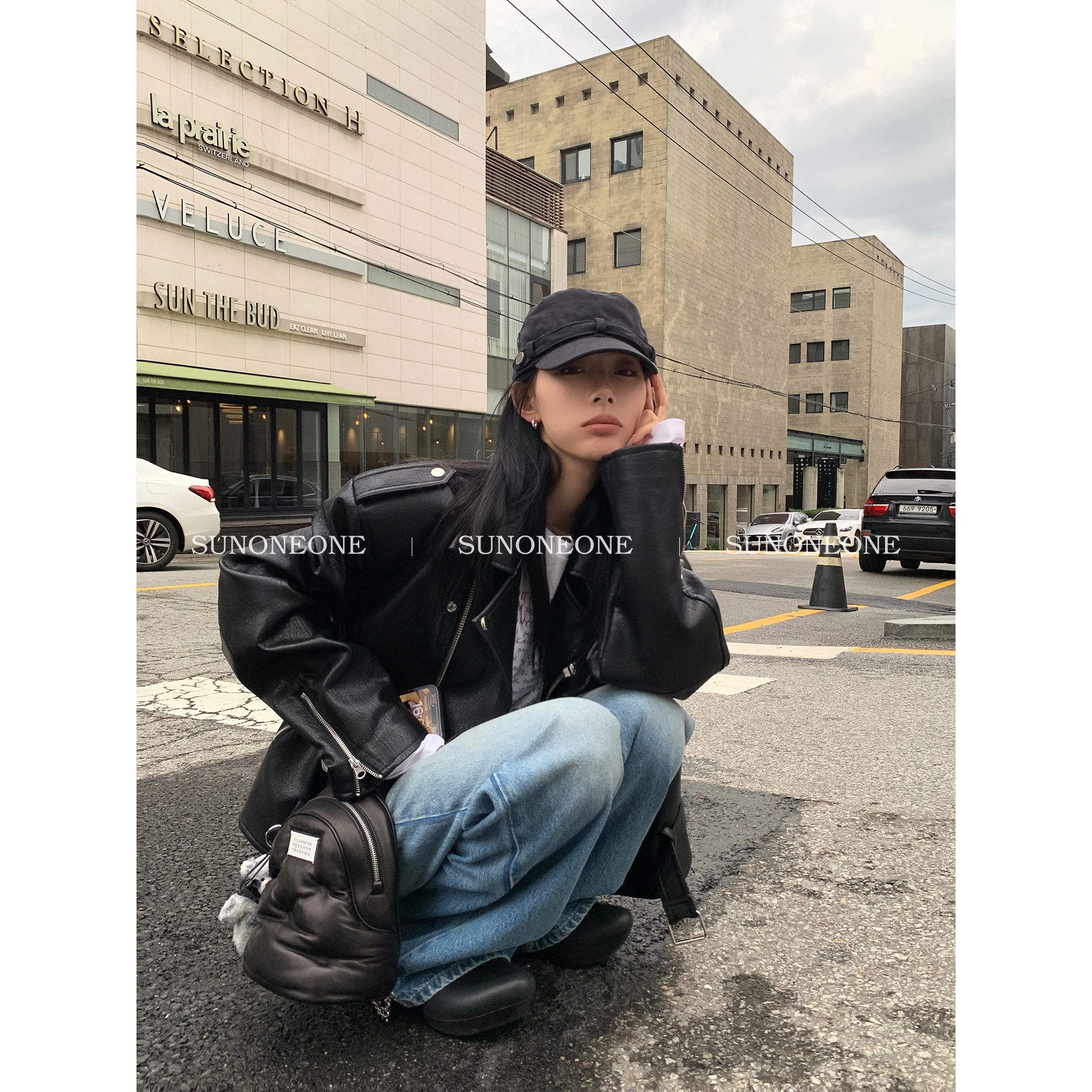 SUNONEONE heavy industry PU leather motorcycle jacket women's autumn and winter retro black leather jacket loose long sleeve slimming top