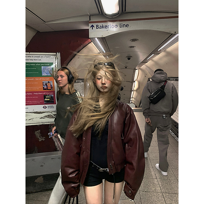 Tongiiuu Manhattan leather jacket American retro loose jacket women's slimming padded jacket warm top winter
