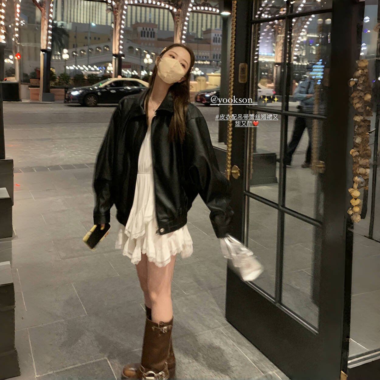 NEVA HU [60% off in stock] black American short pu leather jacket women's high-end sense fried street bike jacket