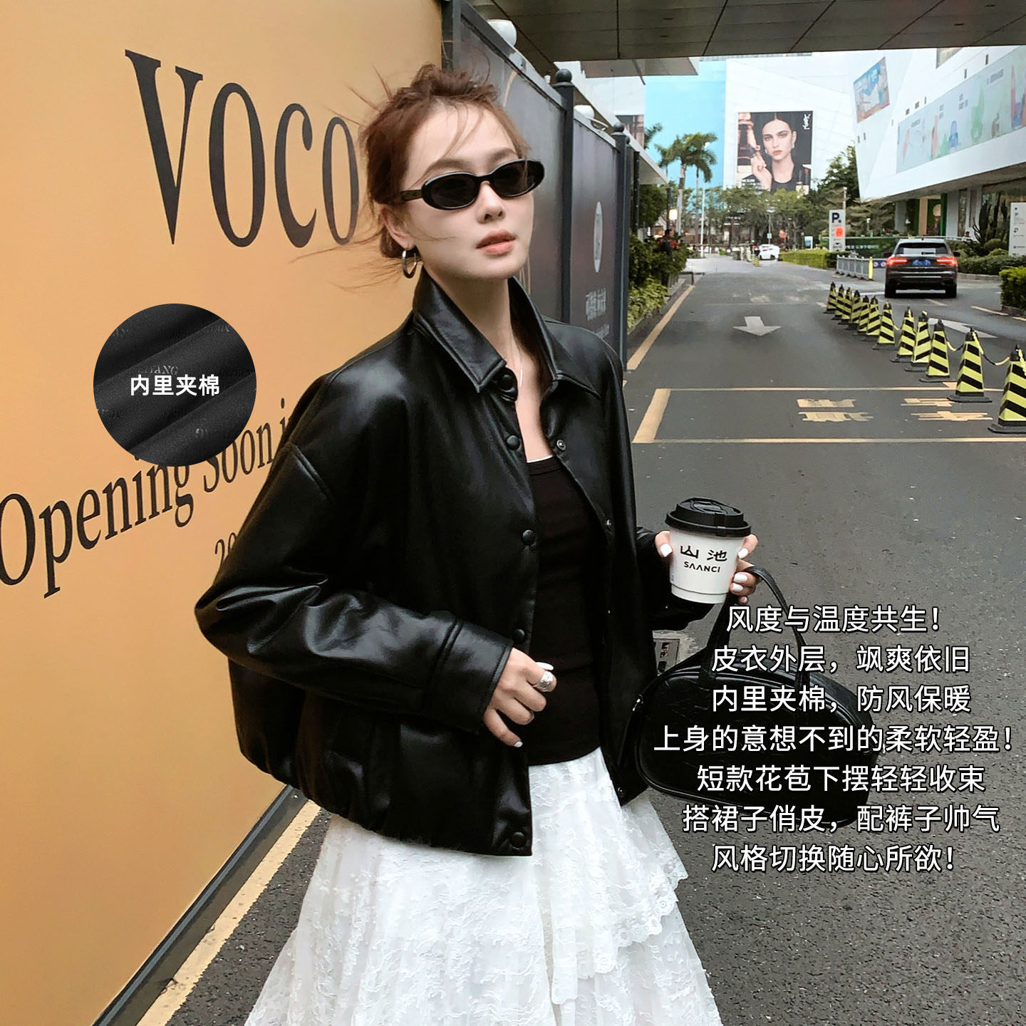 Meiyang flower bud leather jacket padded warm and playful PU lapel jacket top jacket - Monday