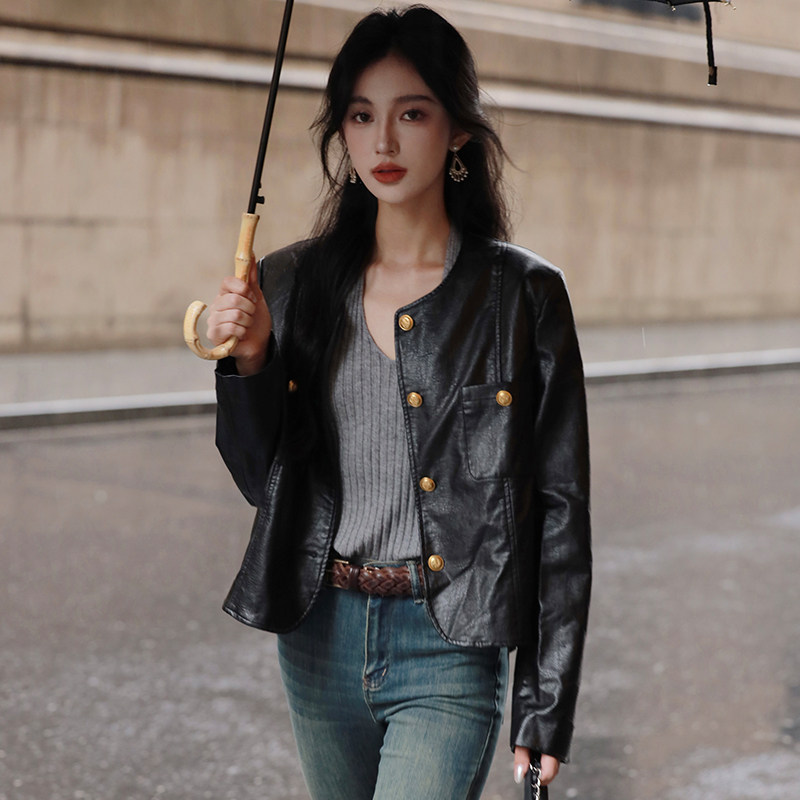 AZure French vintage slim leather jacket small fragrance style black gold jacket commuter PU leather jacket short thin motorcycle suit