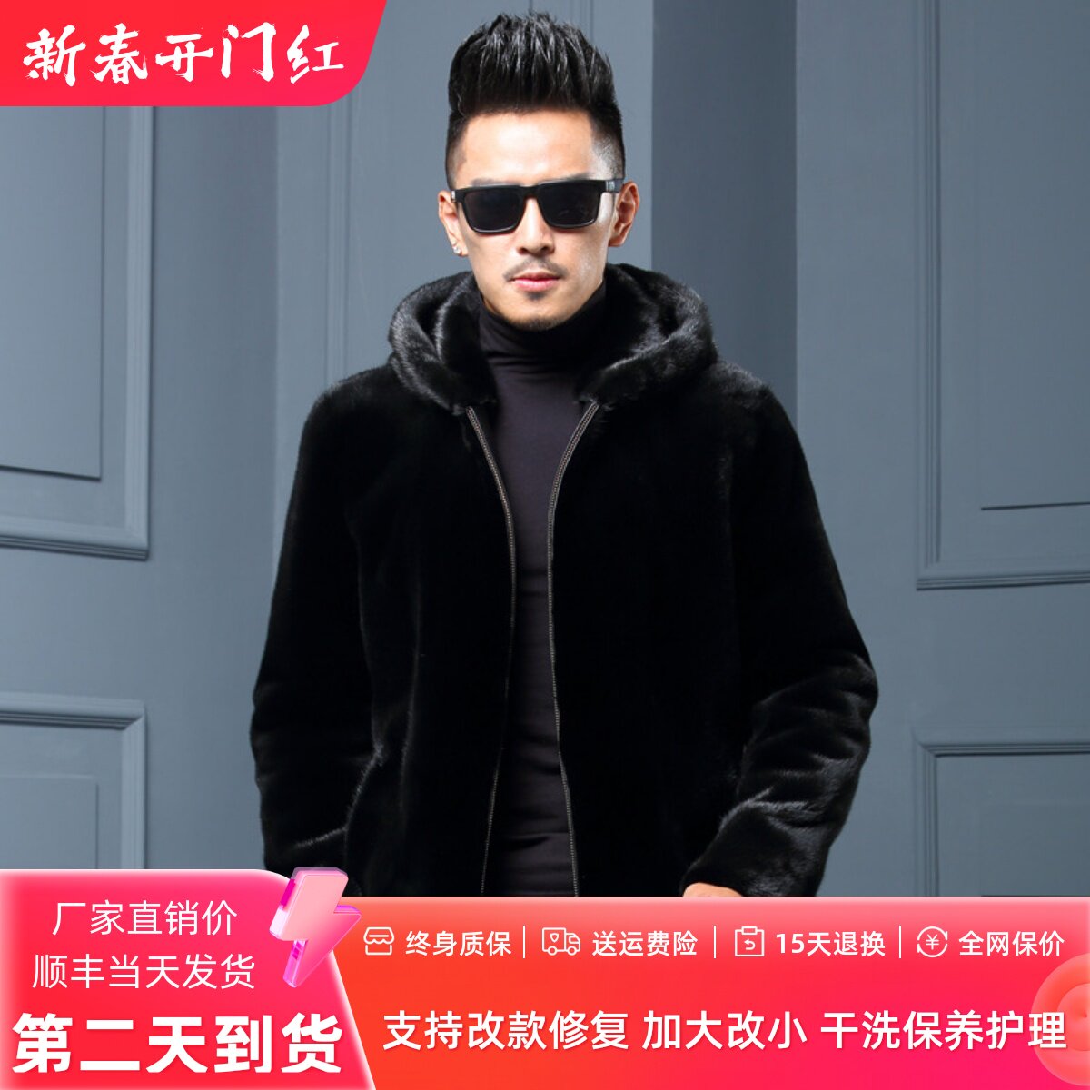2026 imported mink coat men's short zipper with hooded winter mink fur fur coat Haining fur coat