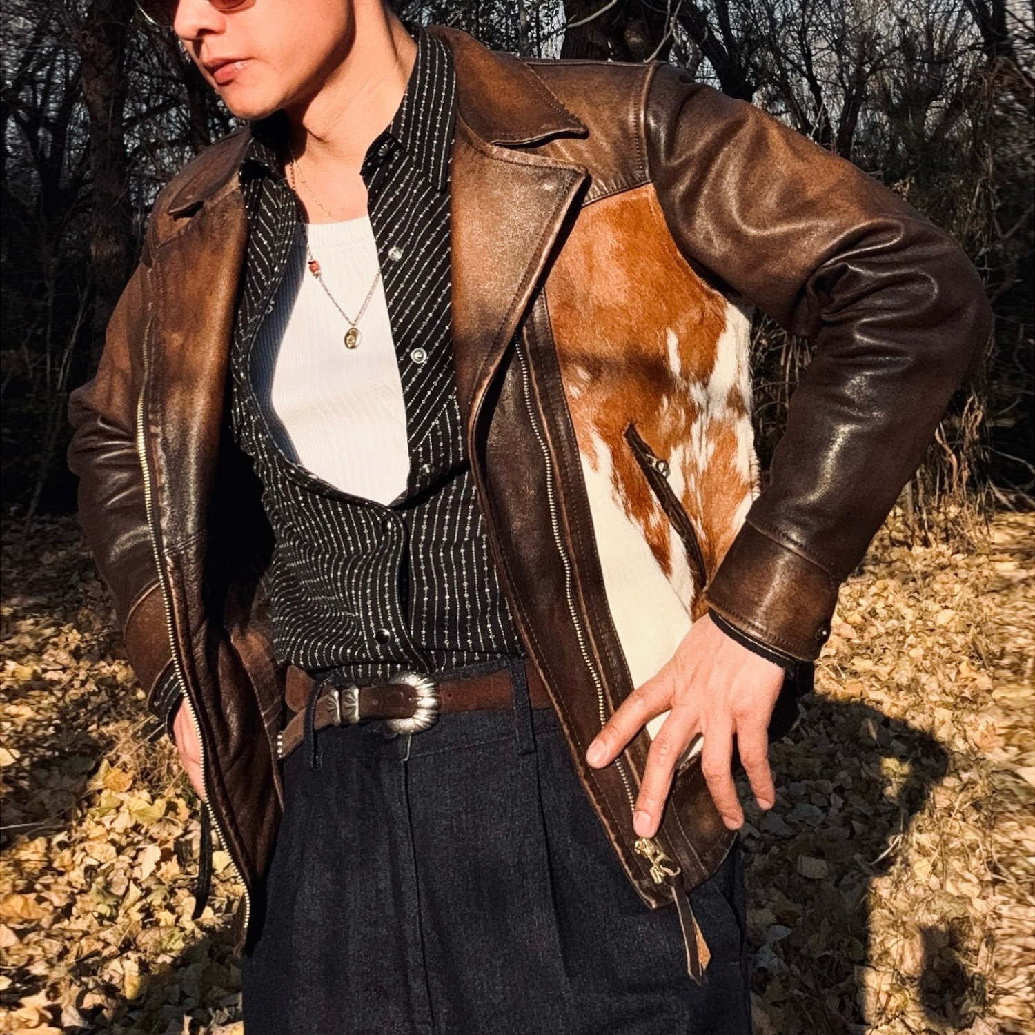NOMA luxury imported from Spain unpainted tanned cowhide silhouette horsebit buckle structured motorcycle collar leather jacket