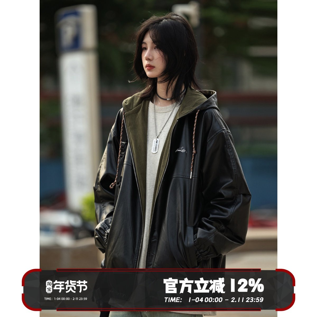 Your first love Lao Wang leather jacket autumn and winter PU leather new American retro motorcycle jacket trendy hooded ins