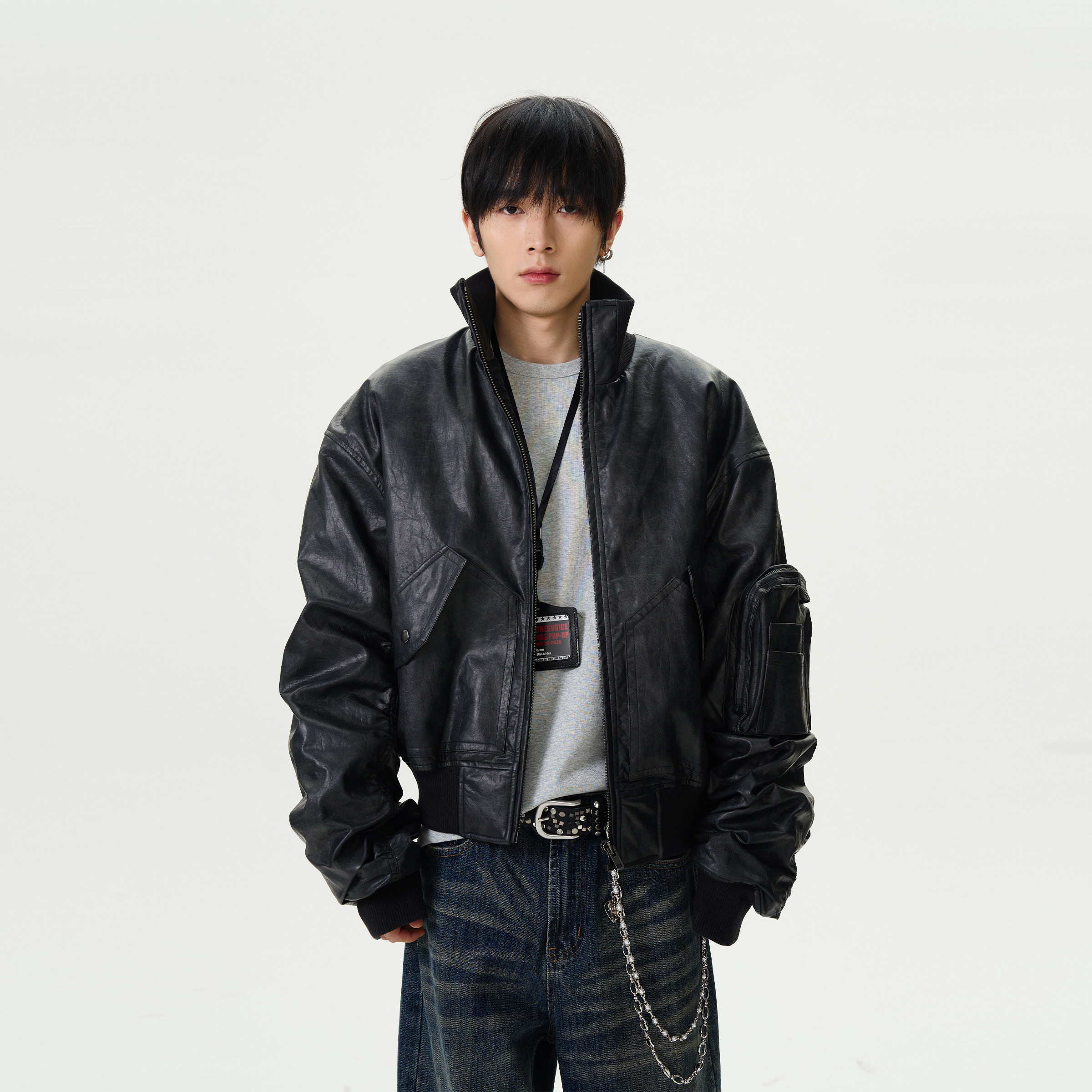 Black bomber silhouette flight jacket men's autumn American straight shoulder short leather jacket high-end sense motorcycle suit